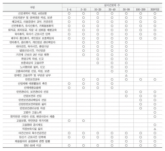 상시 근로자 수에 따른 노동관계법령상 의무는 아래 그림과 같다. 내용이 너무 많아서 대표적인 부분만 짚고 넘어간다.