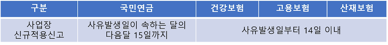 자격취득신고는 사유발생일이 속하는 달의 다음 달 15일까지이지만, 사업장 적용 신고는 14일 이내에 해야 한단다. 자격취득신고는 다음에 상세하게 얘기할게.