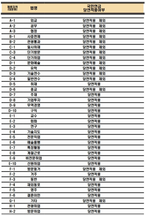 외국인 근로자는 국가에 따라서, 혹은 사회보장협정에 따라서 적용이 안되는 경우가 있긴 한데, 너무 광범위한 내용이 될 것 같아서, 이 글에서는 생략하기로 한다. 아래에 국민연금이 당연적용되는 비자종류와 그렇지 않은 비자종류를 올려 놓았으니까, 참조하렴.