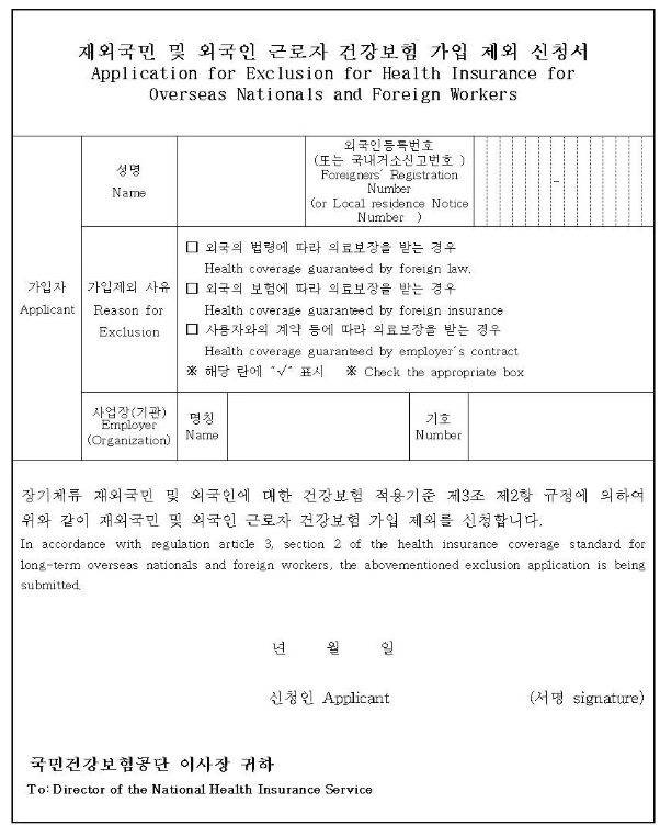 직장가입자 가입대상에서 제외되는 경우도 있어. 외국의 법령이나 보험에 따라 의료보장을 받는 경우라던가, 사용자와의 계약에 따라 의료보장을 받는 경우에는 직장 건강보험 적용제외 신청을 할 수도 있어.