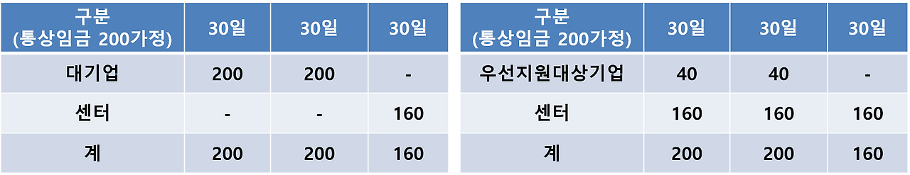 하지만 우선지원대상기업인 경우에는 처음 60일도 급여를 지원해 줘서 90일을 다 고용센터에서 지원해 주는 셈이다. 통상임금의 100%를 지원해 주는데, 한 달 최대한도가 160만원이었다. 근로자가 160만원보다 더 많은 돈(통상임금)을 받고 있는 경우, 처음 60일 동안, 그 차액분을 회사가 지급해야 했다. 유산ᆞ사산휴가와 같은 구조였다.