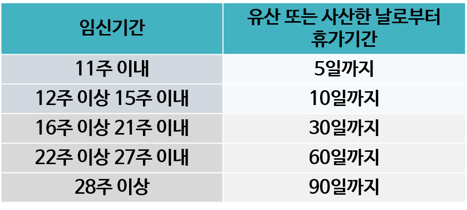 <유·사산휴가 일수(근로기준법 시행령 제43조 참조)>