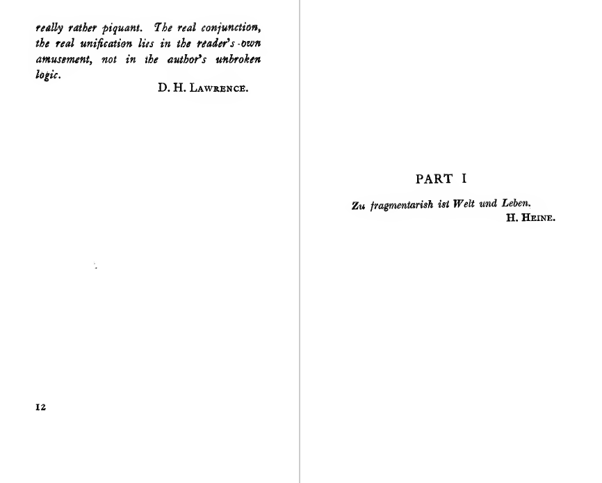 1부는 하이네의 시 구절 "세계와 인생은 조각일 뿐이다"(『노래의 책」)를 제사(題詞)로 쓰면서 시작한다. 120 개의 단상으로 이루어져 있다. 2부는 46개의 단상이 수록되어 있다.