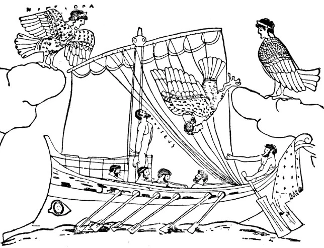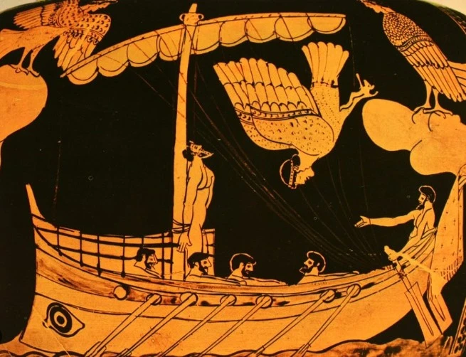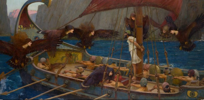 영리하고 유능한 오디세우스, 교활한 오디세우스 –호메로스는 그의 이름 뒤에 이러한 별칭 중 하나를 가장 자주 수반한다. 그의 궁극적인 교활함은 순진한 연기를 통해 드러나는 것일까? 그래서 두 번째 이야기에서 그는 못 들은 척함으로써 그들을 능가한다. 정말 들을 것이 없다. 그들은 노래하는 동작을 취하고 있었고, 그는 그들의 침묵을 듣지 않는 동작을 취하고 있었다.