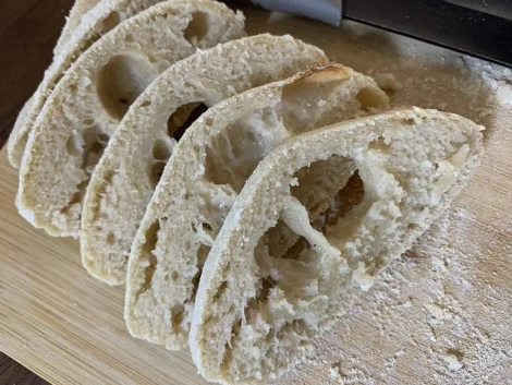 그러나 이번에도 결과는 실패였다. 기공이 골고루 생기지 않은 데다가 어딘가 미묘하게 빵이라고 하기에는 이상한 식감을 내는 음식이 탄생했다. 반죽 수율이 85%여서 그런지 자꾸 퍼져서 모양 잡을 때 반으로 한 번 더 접었는데 그래서 그런 걸까? 그러나 전체적인 식감이 마치 떡처럼 꾸덕한 것으로 보아 그렇지는 않은 것 같았다.
