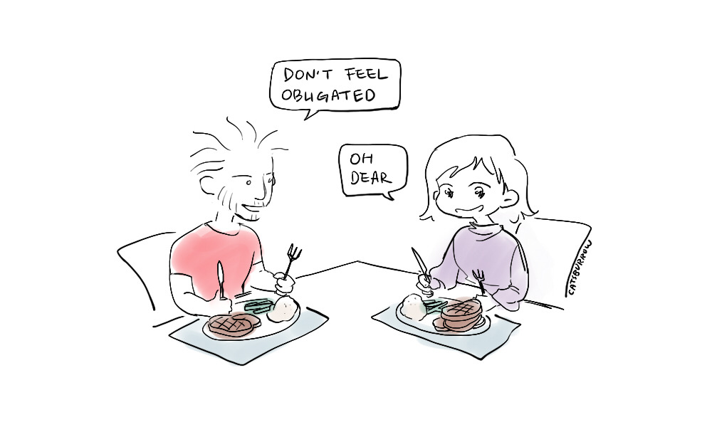 물론 먹는 것에만 쓰여야 하는 것은 아니다. 의무감을 갖지 말라는 얘기니까, 다른 선물 같은 것에도 해당될 수 있다. 상대가 좋아할 거 같아서 준비했지만, 좋아하지 않는다면 사용하지 않아도 좋다는 여지를 남겨줄 수 있다. 내가 신혼초에 사준 츄리닝 바지는 남편에게 그다지 흡족하게 맞지 않았다. 집에서도 청바지를 입고 있는 남편에게 좀 편히 입으라고 구입했지만, 키는 190cm나 되지만 마른 편이다 보니, XL로 사면 품이 너무 크고, M 정도로 사면 길이가 짧아지기 쉽기 때문에 옷 사는 것이 쉽지 않다. 그럴 때에도 건네주며 역시 이렇게 말할 수 있다.