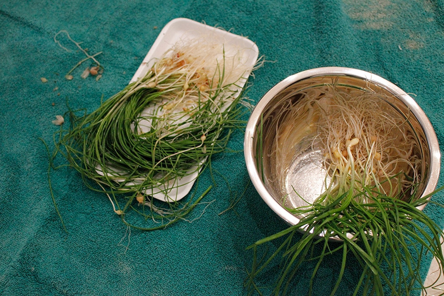 1. 달래를 손질한다. 뿌리 아래쪽 검은 부분을 제거하고, 뿌리 겉의 지저분한 부분도 벗겨낸다.