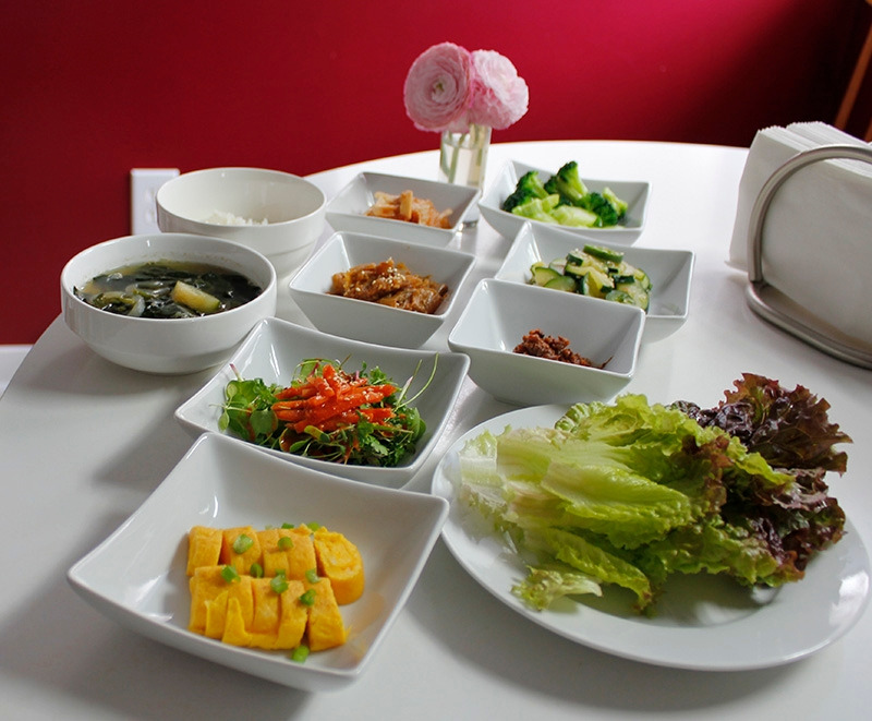 이렇게 준비가 다 되었는데, 반찬을 보니 온통 풀밭이다. 흠! 단백질은 어쩌나? 그래서 급히 달걀을 하나 말았다. 파라도 좀 넣을 것을, 그냥 달걀만 말았더니 참으로 맹숭맹숭하구나. 그래도 기분을 내서 상을 차렸다. 특별식은 없지만, 가지런히 반찬을 담아놓았다.