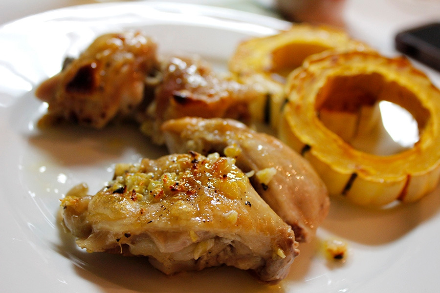 치킨은 적당히 익었고, 위쪽의 껍질은 바삭하며 쫄깃했다. 고기 부분도 촉촉하면서 탄력 있었다. 보통 버터를 둘러서 구워 먹던 이 호박도 버터 없이 충분히 그 풍미를 뽐냈다. 한국이라면 단호박으로 대신 할 수 있을 것이다.