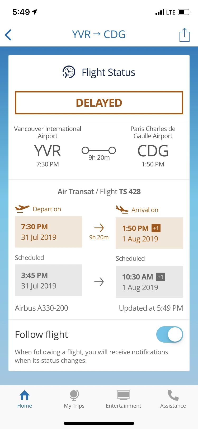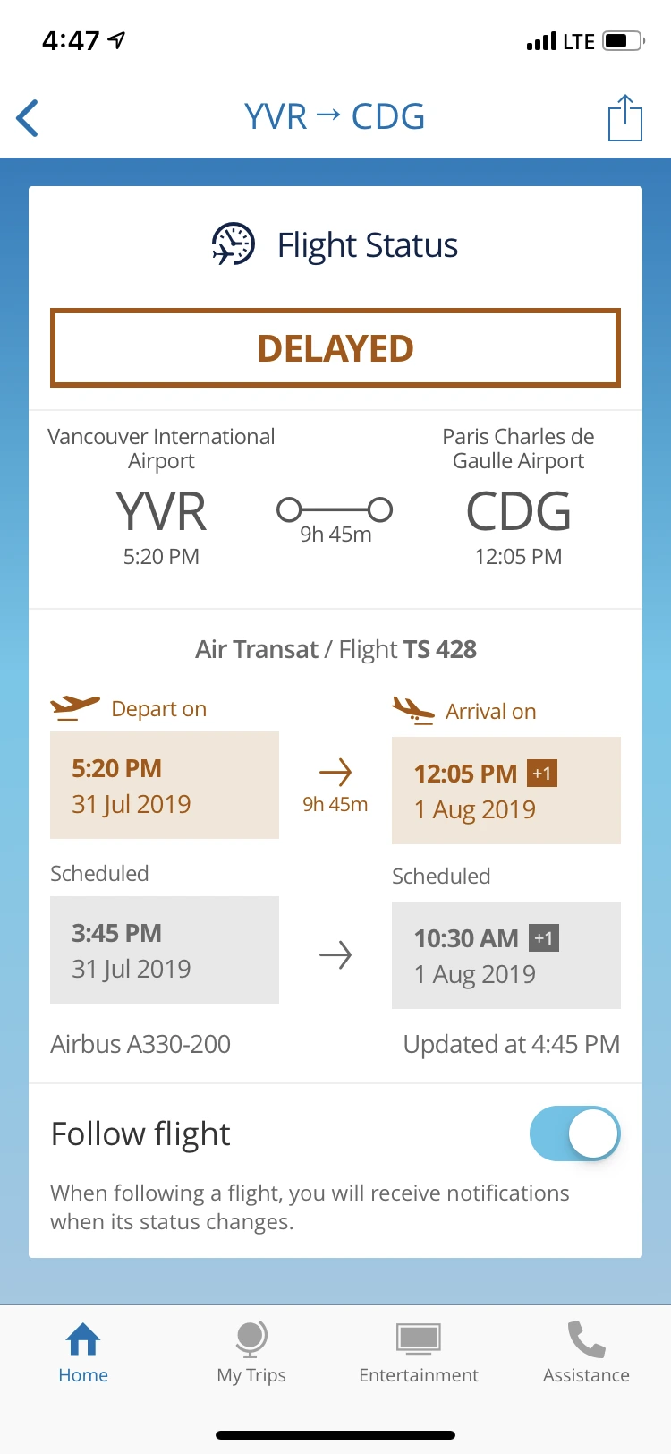 갑자기 폰에 delayed 알람이 왔다. 시간이 다시 두 시간 미뤄진 것이다. 비행기 바퀴에 결함이 있어서 고치느라 시간이 좀 걸린다는 것이다. 그래도 아직은 괜찮아...라고 긍정적으로 생각했는데, 거의 보딩 시간 다 되어서 다시 delayed가 떴다. 이제는 파리 도착 후 노르망디로 가는 기차를 타는 것이 불가능해진 것이다. 기차 시간은 2:48, 파리 도착 예정시간은 1:50. 짐 찾아서 기차역까지 가는 것은 도저히 꿈도 꿀 수 없게 되어버린 것.