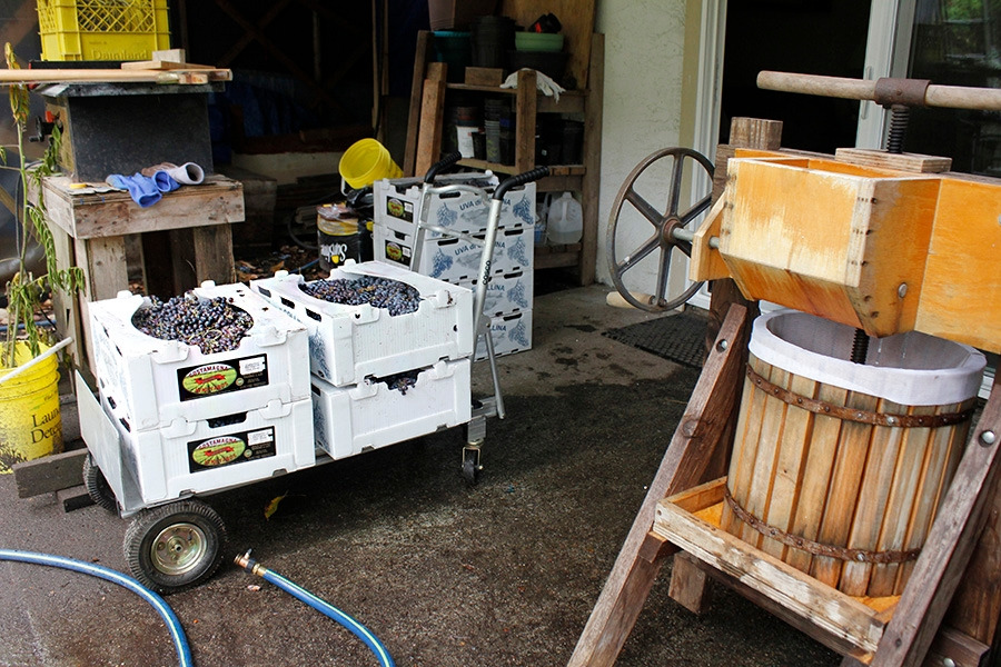 지난번 애플 사이다 만들기 (클릭) 글을 읽었던 독자들이라면 이 장소가 익숙할 것이다. 우리 집 뒤뜰의 작업장소이다. 애플 사이다 만드느라 착즙 했던 도구가 오른쪽에 보인다. 포도 착즙 전에, 먼저 만들었던 애플 사이다 비니거의 착즙을 먼저 여기서 하였다. 그렇게 해서 발효통을 확보하느라...