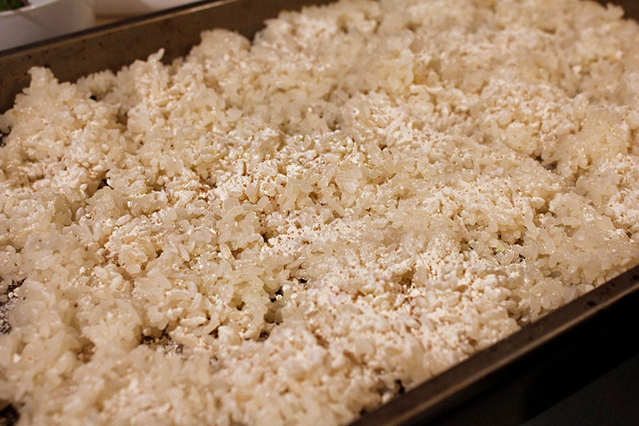 8. 이스트 볼을 잘게 부숴서 준비한 이스트와 함께 밥과 고르게 섞어준다. 쟁반에서 편하게 섞는다.