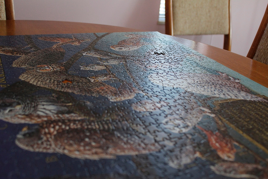 자잘한 그림이 많고, 다 비슷한 부엉이 깃털들, 비슷한 배경색 때문에 맞추기 그리 쉽지는 않았다. 하지만 그것은 역시 퍼즐의 재미가 아니겠는가! 딸은 그렇게 다이닝 테이블에 앉아서 퍼즐을 맞추기 시작했다. 그리고 나는 오며 가며 한두 개씩 거들다가, 또 정신이 팔려서 한참 동안 같이 앉아있다가 하면서 시간을 보냈다. (그러느라 정신이 팔려서, 퍼즐 맞추는 중간 사진은 찍지도 않았구나!)