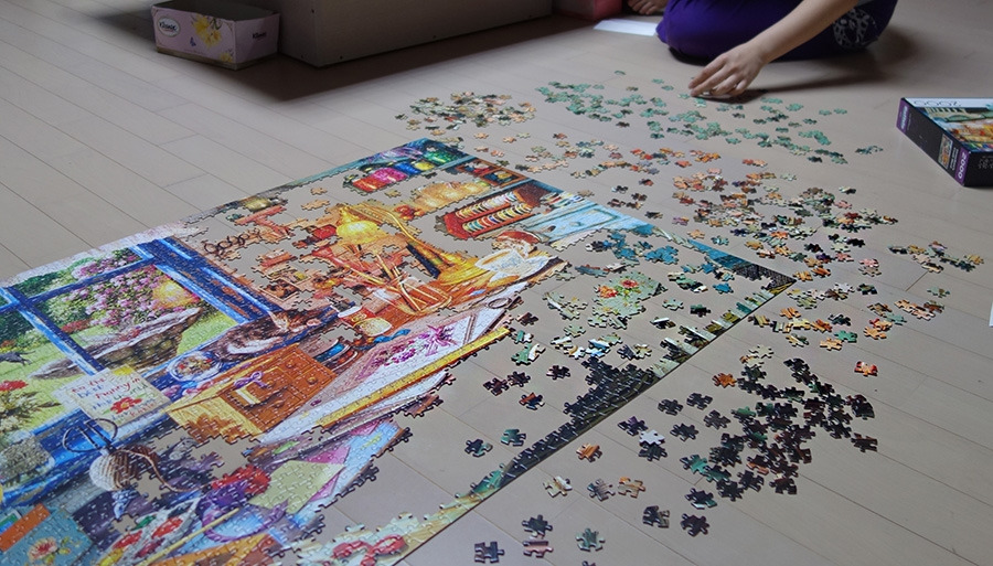 우리 모녀는 퍼즐 맞추기를 좋아한다. 그래서 시간 날 때면 퍼즐을 펴놓고 놀기를 좋아했다. 300~500피스 정도는 그냥 눈감고도 순식간에 맞추는 수준이고, 1000피스도 대부분 반나절이면 충분히 끝낸다. 명절 연휴에는 휴식한다면서, 널브러져 앉아서 퍼즐을 맞추곤 하였다.