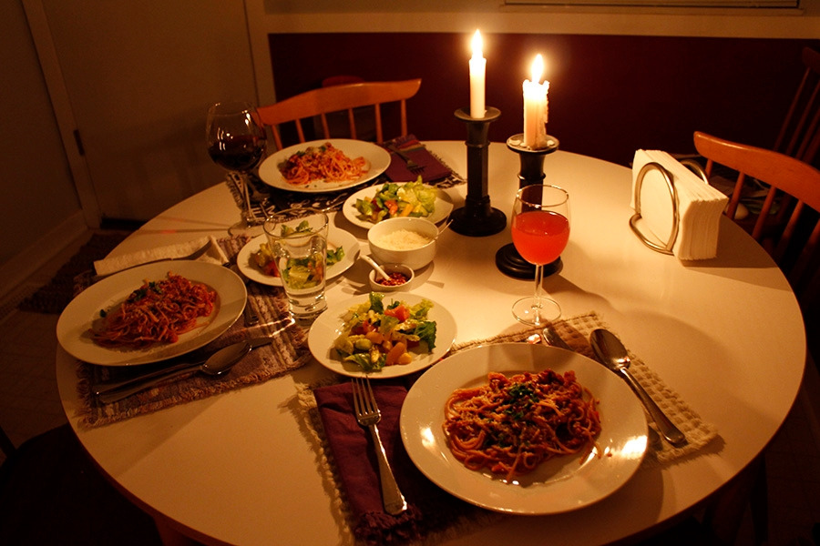 준비가 진행되면서 테이블을 세팅하고, 샐러드를 가져다 놓았다. 그리고 위에 뿌릴 파르미지아노 치즈와 페퍼 플레이크도 준비했다. 분위기 너무 좋았다. 적당한 어둠 속에서 남편은 와인을, 나는 워터 케피어 음료를, 딸은 물을 놓고 건배를 했다. 어둠 속에서 요리를 마쳤지만, 파스타는 딱 적당하게 익었고, 위에 뿌린 치즈와 파슬리, 페퍼 플레이크가 아주 잘 어울렸다. 샐러드도 언제나처럼 신선하고 짭조름한 맛이 일품이었다.