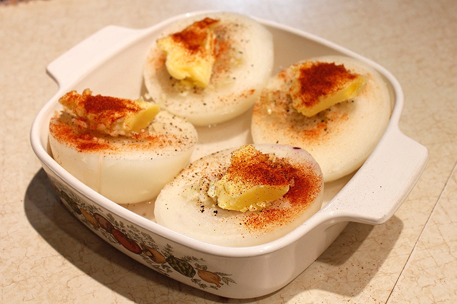 양파는 반으로 썰어서, 물을 자박하게 깔은 코닝 냄비에 담고, 버터 얹고, 소금, 후추, 다진 마늘, 스모크드 파프리카를 뿌려서 뚜껑을 덮고 전자레인지에 중간 강도로 돌린다. 한 10~15분 정도 걸린다. 부드러워지고 매운맛이 사라지되, 너무 익어서 주저앉지는 말아야 한다.