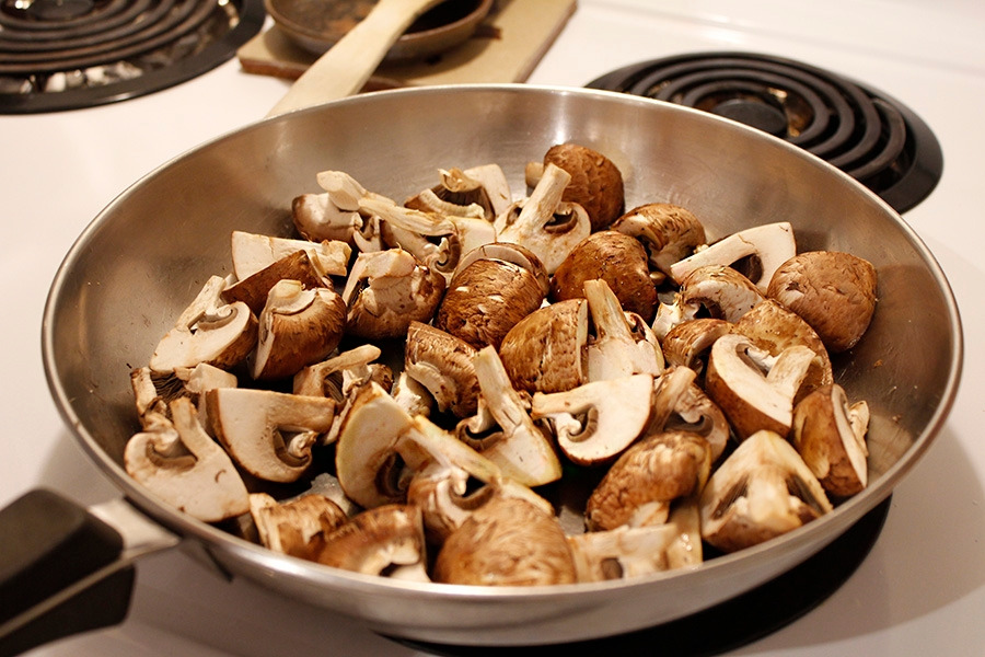 이제 팬을 불에 올려서 예열을 하고, 올리브유를 두 큰 술 정도 둘러준 후, 버섯을 투하하였다. 불은 중강 불로 사용했다. 지금 이 과정은, 버섯을 노릇하게 만들어주는 과정이다. 따라서 불이 약하면 안 된다. 줄리아 차일드 선생님이 영화 줄리 & 줄리아에서 "버섯이 북적이게 하지 마세요!" 그랬는데, 그만 북적이게 되고 말았네. 하지만, 일반 가정에서 얼마나 더 한산하게 할 수 있단 말인가. 다만, 두 겹이 되지는 않도록 하자. 딱 한층만 깔아준다.