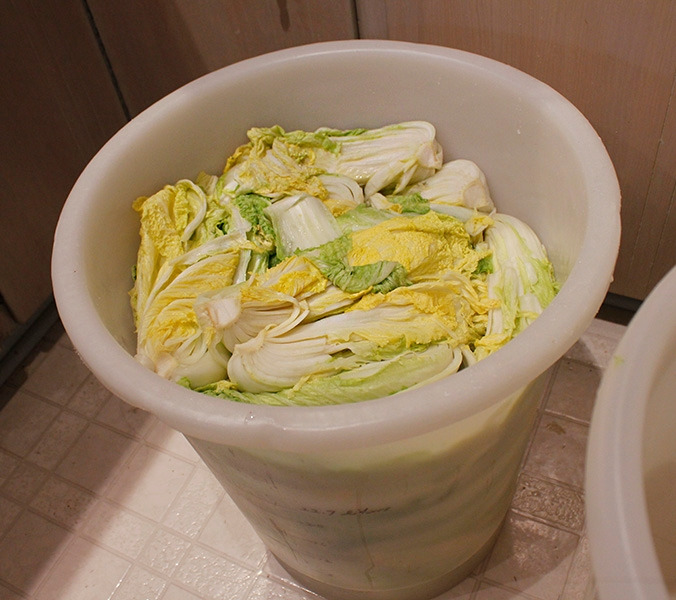 그러면서 계속 배추가 절여졌는지 기웃거리면서 뒤적여줬다. 두 개의 통을 채웠던 배추는 줄어들어서 결국 하나의 통으로 다 들어갔다. 저녁을 먹고 나서도 한 참 있다가 10시 넘어서야 배추를 씻어서 널기 시작했다. 상태를 봐가면 잘 절여진 것들부터 먼저 씻었다. 배추 씻는 데에만도 시간이 한 참 걸린다. 배추 속으로 은근 흙이 많다. 그래도 배추가 맛있어 보여서 다행이었다. 미국에서 가져온 것이라고 했는데, 많이 뻣뻣하지 않고 속대가 노랗게 맛있어 보였다.