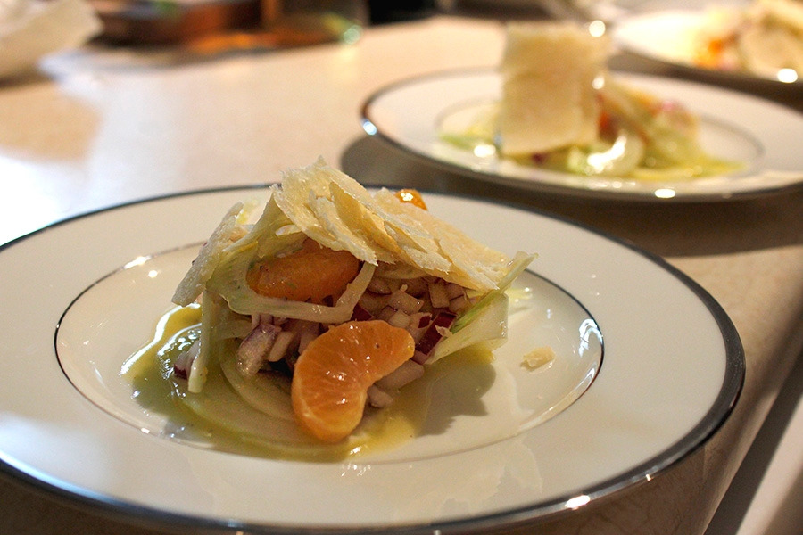 본식을 끝낸 후에도 아직 여러 코스가 남아있었다. 이번엔 샐러드(Insalata) 차례였다. 올리브유와 앤쵸비를 넣어 유화한 풍미로운 소스에, 회향과 적양파, 과일을 곁들이고 파르마잔 치즈를 얹어서 풍미를 높여주었다.