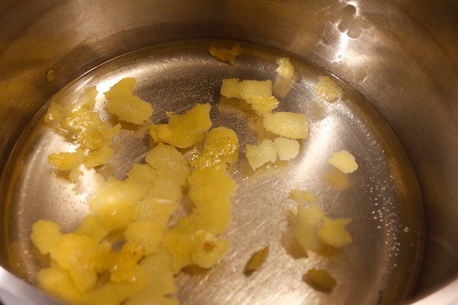 4. 불을 끄고, 레몬 껍질을 건져낸 후, 시럽이 식도록 둔다.