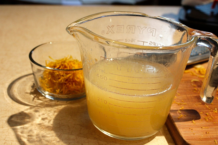 레몬즙이 제일 중요하기는 하지만, 위에 장식할 레몬 제스트(lemon zest)가 있으면 좋으니, 이왕이면 즙을 내기 전에 레몬을 깨끗이 씻어준 후, 껍질을 먼저 긁어내는 것이 편하다. 이때 레몬 껍질의 흰 부분까지 긁으면, 떫고 쓴 맛이 들게 되므로 전적으로 겉의 노란 부분만 벗겨야 한다. 칼로 벗기면 아무래도 두꺼워지기 때문에 치즈 갈 때 쓰는 채칼 같은 것을 사용하면 효과적으로 레몬 제스트 만들 수 있다.