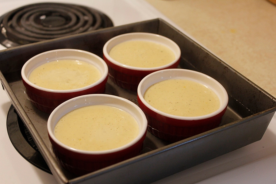 6. 팔팔 끓는 물을 램킨 볼이 반 정도 잠기도록 사각팬에 부어주고, 예열된 오븐에 넣는다.