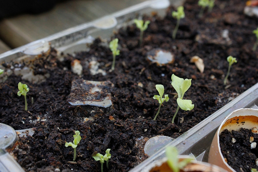 왼쪽에 흐리게 보이는 깻잎 모종은 태어난 지 한 달도 넘은 것인데, 너무 웃자라서 저대로 성장이 멈췄다. 아무리 둬도 변화가 없었다. 하지만 달걀 껍데기 안에 이 녀석은 일주일도 채 안 되었는데 짧고 단단하게 자라서 두 번째 잎을 내고 있다.
