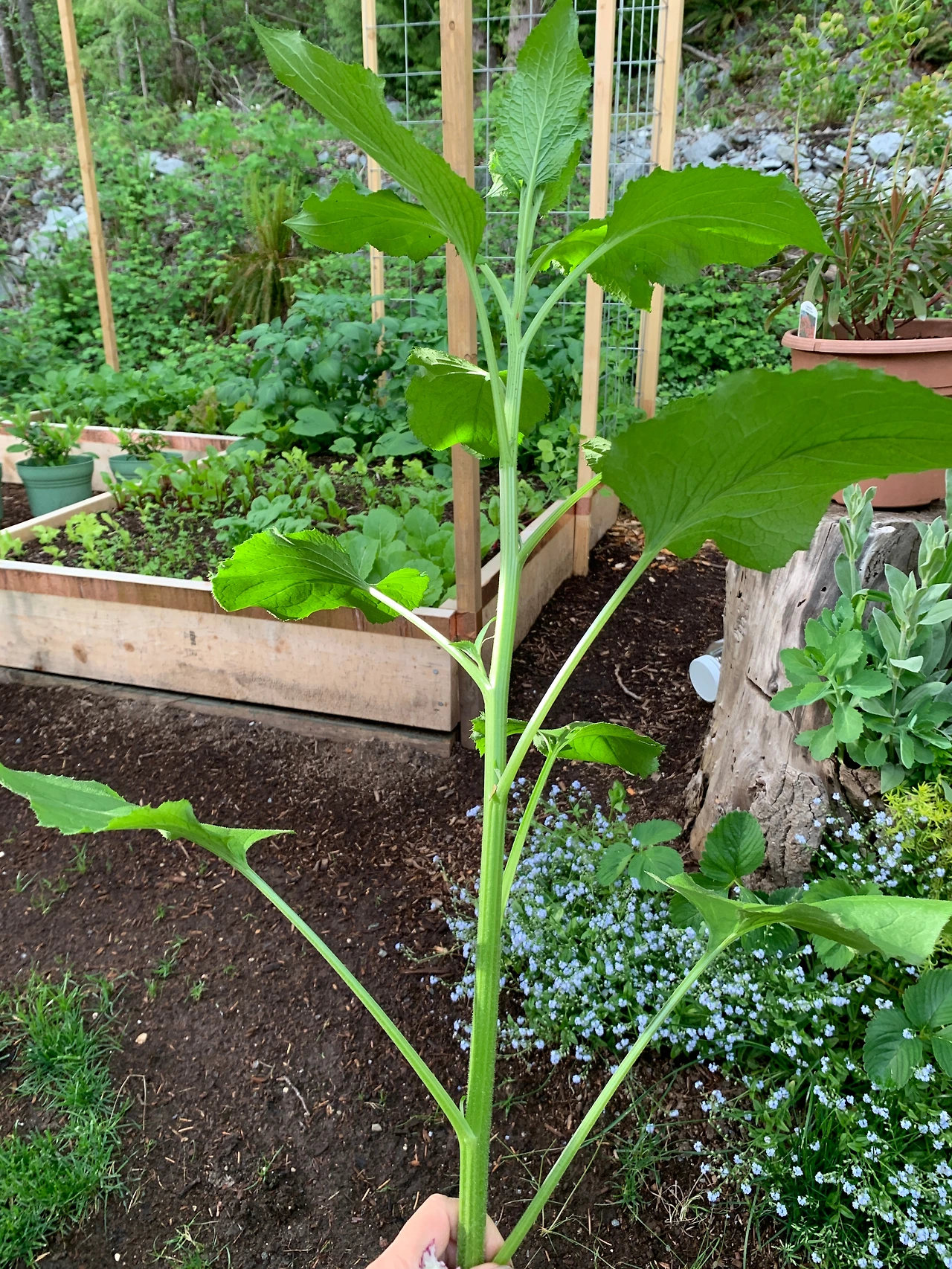 세상에 이게 무슨 나무인가? 이렇게 큰 녀석을 그냥 잘라 버렸네. 그래도 사실 막상 먹을 부분은 그리 많지 않다. 이렇게 뽑아서 들고 올라오니 남편이 막 웃는다. 내친김에 상추랑 갓도 좀 잘랐다.