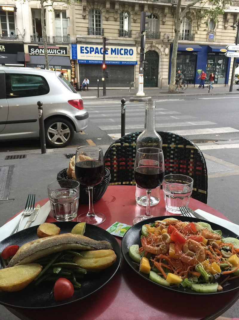 결국은 너무 배가 고파지는 지경에 이르렀고 모퉁이에 있는 식당을 골라 들어갔다. 테라스에 자리를 잡고 앉으니 살 것 같았다. 오늘도 지겹게 걸었구나. 주문을 하려고 메뉴판을 보니 책을 가지고 만들어서 재미있어 보였다. 열심히 식당을 골라서 들어갔지만 결국 이곳은 프렌치 식당은 아니었고, 약간 퓨전 집이었다. 우리는 둘 다 오늘의 메뉴에서 그냥 골랐는데, 그래도 남편이 고른 감자와 껍질콩을 곁들인 농어구이는 프렌치 스타일이었지만, 내가 선택한 새우 샐러드는 타이음식이었다! 이런! 메뉴가 불어로 쓰여있으니 당연히 프랑스식 음식일 거라는 착각을 일으키게 되는 것 같다! 그래도 서비스는 친절한 편이었고 일단은 뭔가 먹을 수 있어서 좋았다.