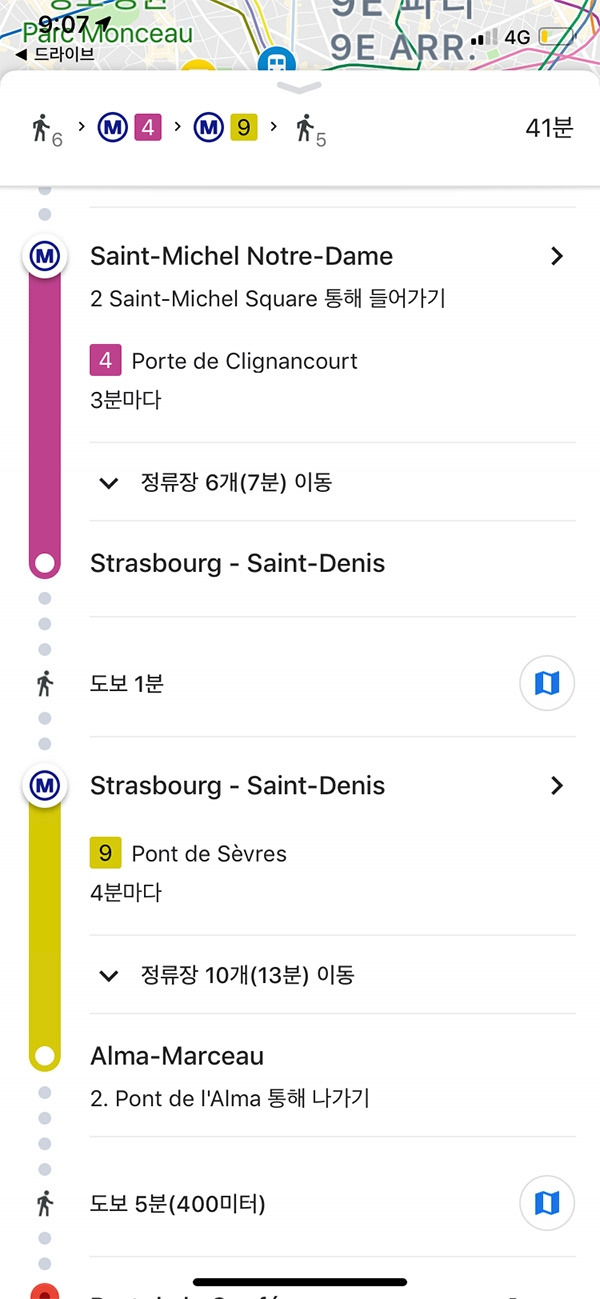 내가 온라인으로 구입했던 할인 티켓은 Beateaux-Mouches (바또무슈) 유람선 티켓이었다. 얼른 시간표를 검색해보니, 30분마다 한 대씩이었던 줄 알았던 것은 나의 착각이었고, 게다가 우리에게 남은 것은 오직 10시 출발 편 밖에 없었다. 그리고 그게 마지막 배였다! 허둥지둥 교통편을 확인해보니, 식당에서 선착장은 상당히 멀었다! 무슨 생각을 했던 거지? 왜 우리는 굳이 생미셸역으로 와서 저녁을 먹은 것일까? 진작 이 생각을 했으면 그 동네에 가서 뭔가 먹었을 텐데... 총 시간 41분, 그리고 그때 시각이 9:07이었다. 아직 식사 완료도 안 한 상태였기 때문에 무리를 해서라도 여기에 가는 것이 맞을까를 고민했다.