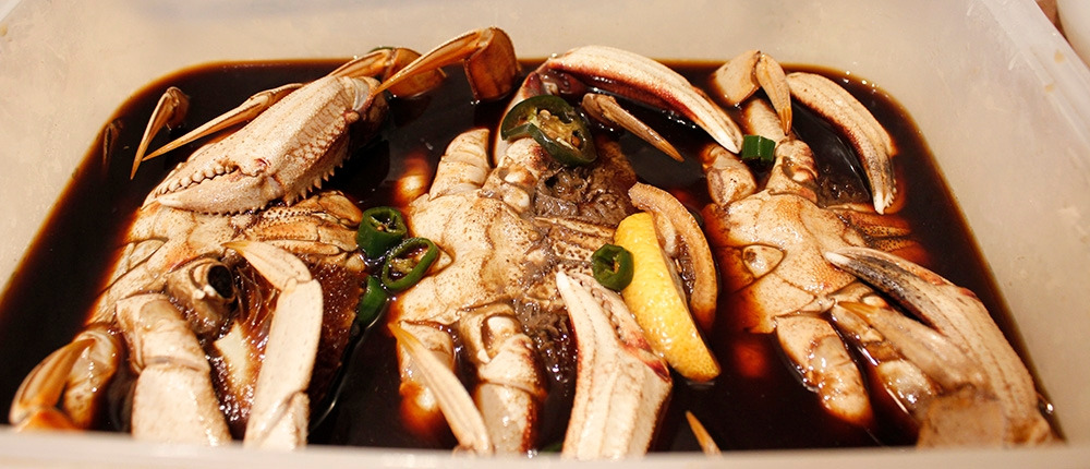 7. 게를 뒤집어서 놓고 간장물을 부어준다. 산 게는 숨을 쉬어서 양념이 속까지 더 잘 들어가는 장점이 있다.