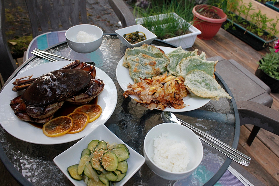 다음날 보니 완전히 녹지 않은 것 같아서, 먹기 30분 전쯤에 냉장실에서 꺼내 두고, 다른 반찬들을 급히 준비했다. 남편이 처음 먹어보는 간장게장인데 입에 맞지 않는다면 먹을 게 없는 밥상이 될 수도 있다는 것을 생각한 반찬들이었다. 집에서 딴 깻잎과 가지 잎을 튀김옷 입혀서 튀겨주었고, 남편이 좋아하는 호박무침도 곁들였다. 급히 하느라 프라이팬이 덜 달궈져서 김치전은 너덜너덜! 아이고!