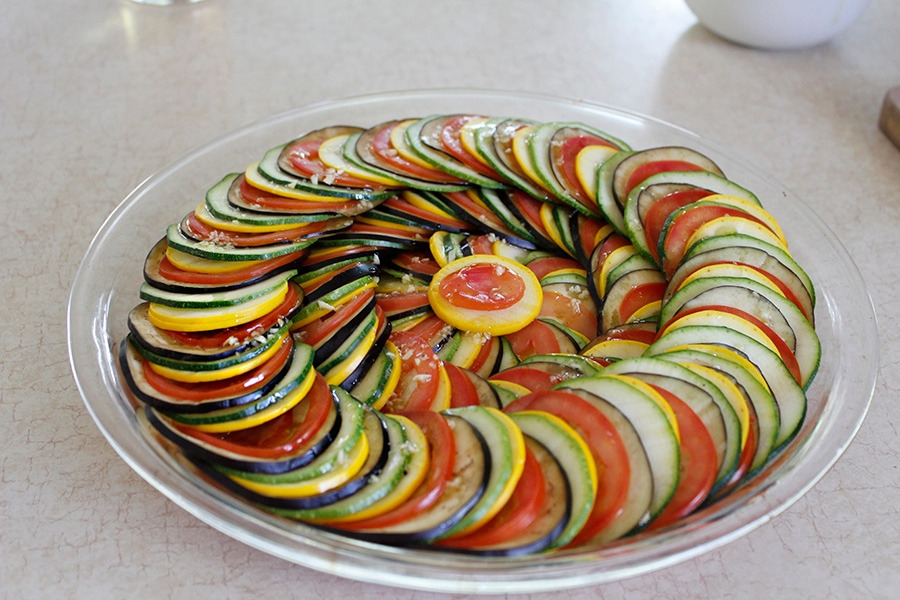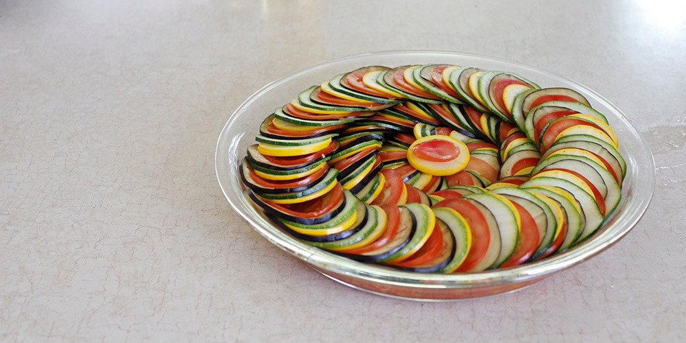 2. 얇게 썰은 야채를 번갈아가며 라따뚜이 모양으로 깔아준다.