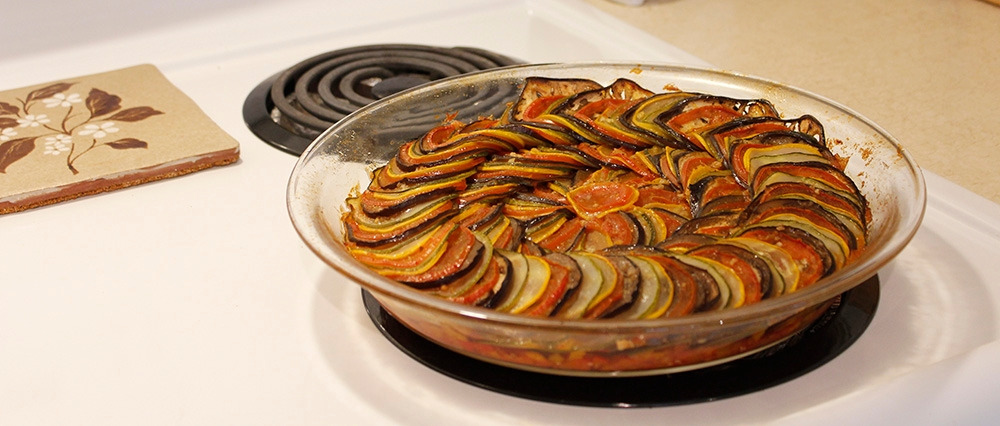 둥근 식기가 없으면 네모난 데에 담아도 된다. 식구가 많다거나 손님 초대를 한다면 양을 늘려서 큰 곳에 하면 좋다. 아래 사진은 나의 첫 라따뚜이이다. 토마토가 모자라서 시판 소스를 섞었더니 색이 진하다. 그리고 노랑 스쿼시 없어서 잘라서 파는 큰 호박의 한 덩어리를 사다가 최대한 비슷한 모양으로 썰어서 모양이 살짝 다른데, 그래도 나름대로 괜찮지 않은가?