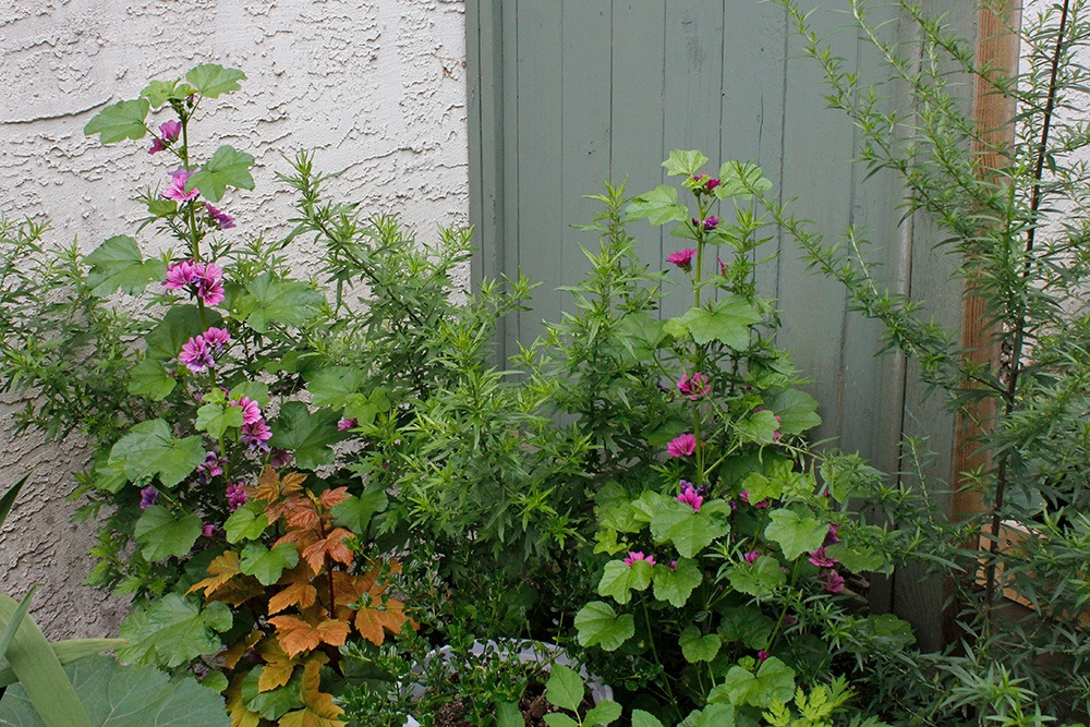 그런데 자라면서 모양이 사뭇 달랐다. 처음에는 완전히 똑같았는데, 어느 순간부터 맬로우는 길쭉하게 자라면서 잎은 크게 발달하지 않았고, 아욱은 큼직한 잎이 턱턱 달리기 시작했다. 아무래도 이상해 보여서 다시 찾아보니, 맬로우는 당아욱이었다. 아욱국을 끓이는 그 아욱과는 다른 꽃이었던 것이다. 아욱도 꽃이 피기는 하였지만 아주 작고 조용한 느낌의 꽃이었다. 사실 멀리서 보면 꽃이 보이지도 않을 정도...
