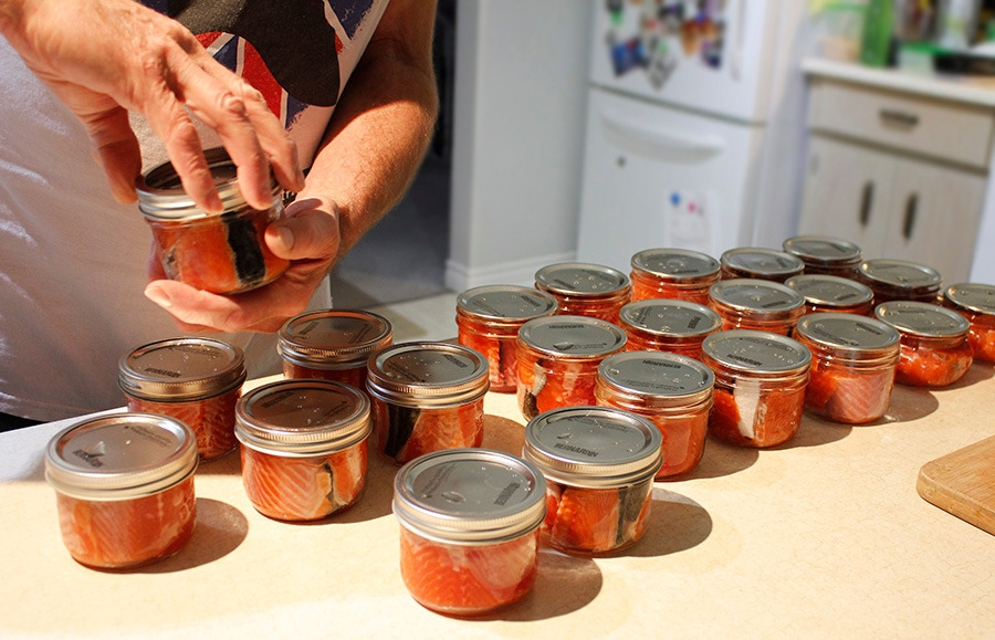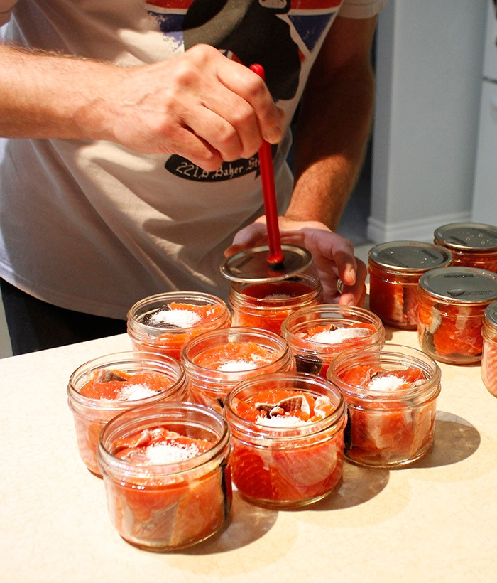 해산물을 좋아하는 남편이지만, 생선은 좋아하는 종류가 한정되어있다. 그중에 가장 즐겨 먹는 것은 연어이다. 그래서 우리는 연어를 종종 구입하여 회로도 먹고, 구워 먹거나, 차우더를 만들어 먹기도 한다. 하지만, 훈제를 하거나 '캐닝(canning)'을 하면 장기 보관하여 다른 풍미를 즐길 수도 있다. 우리는 오늘 그중에서 캐닝을 하였다. 낚시를 즐기는 지인이 최근에 고맙게도 연어를 잡을 때마다 한 마리씩 나눠줘서 캐닝을 할 만큼의 양이 준비되었기 때문이다.