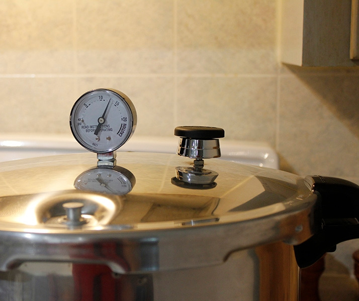 이제 뚜껑을 닫고 물을 끓이기 시작한다. 이때 추는 올리지 않고, 최대한 물이 끓어 차오르게 만든다. 수증기가 아래 사진(왼쪽)처럼 나오기 시작하면 그때부터 10분을 재서 충분히 수증기가 발생하면서 안에 기본 압력이 차도록 기다린다. 그러고 나서 추를 올리고, 압력을 10까지 올린다. 이때부터 온도를 조절하여 100분간 끓이는데, 압력이 10 파운드 이하로 떨어지지 않게 잘 관찰한다. 그 이하로 떨어지면, 처음부터 100분을 다시 채워야 한다.