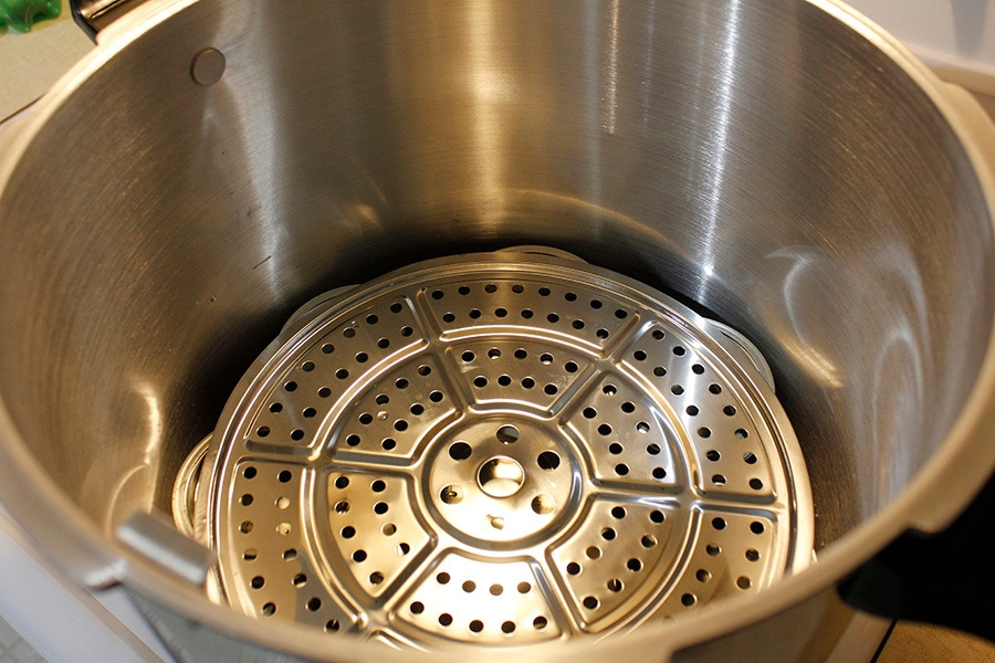 4. 압력솥에 물을 4리터 정도 넣고, 바닥에 뚜껑용 링을 깔아준 후 랙을 올린다.