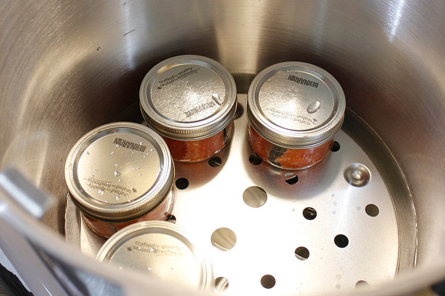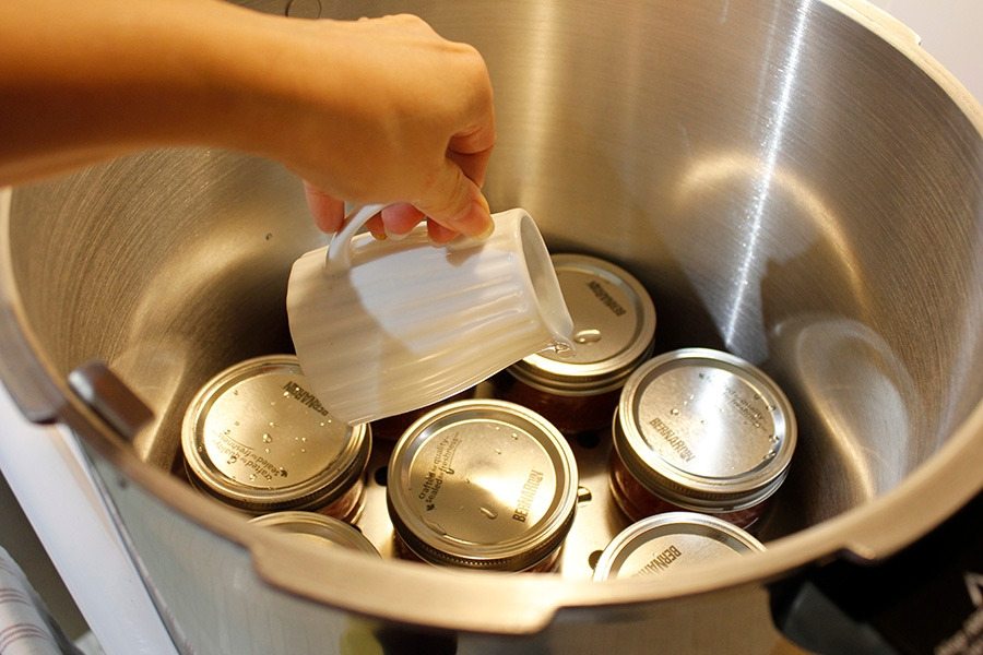 이제 커다란 압력솥에 넣어서 캐닝을 시작한다. 바닥에 유리병이 직접 닿으면 안 되므로, 판을 놓아 바닥으로부터 간격을 떼어준 후, 물을 자박하게 붓고, 준비된 병들을 넣는다. 한 번에 넣을 수 있는 양이 얼마 안 되므로, 우리는 세 겹을 쌓았다. 끓이는 물에 식초를 넣어주면 병에 얼룩이 지지 않고 말끔하게 된다고 해서 조금 넣어줬다.
