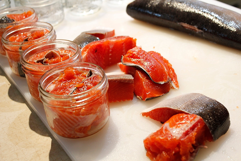 3. 연어를 적당한 크기로 잘라서 병에 담는다. 위쪽에 2cm 정도 남기고 나머지 부분은 꽉 채운다.