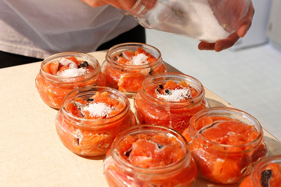 이제 연어를 병의 높이 맞게 자른다. 그리고는 병의 입구에서 2cm 남겨두고, 최대한 공기층이 생기지 않게 빡빡하게 연어를 채워 넣는다. 이왕이면 껍질이 안쪽으로 들어가고, 겉으로 분홍색 살이 보이게 담는 것이 보기에 더 예쁘므로 그렇게 담는다.