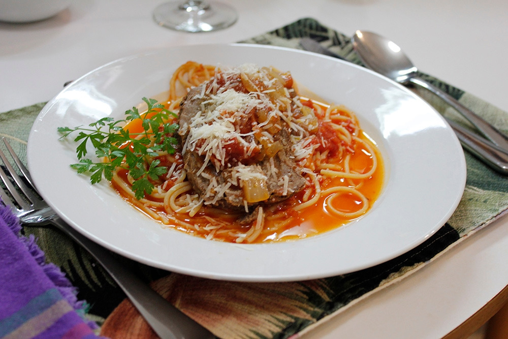 그리고 내가 글 쓴다고 딴 짓 하는 사이에 브라치올레는 어느 덧 거의 소스에 잠겨있었다. 이렇게 푹 담가서 한시간을 뭉근히 끓여준다. 그러면 토마토소스가 고기 안으로 스며들면서 풍미가 더해지고, 고기가 연해진다. 남편이 사용한 토마토 소스는 지난 가을 집에서 캐닝한 소스와 페이스트였는데, 역시 기대를 저버리지 않는 맛을 냈다.