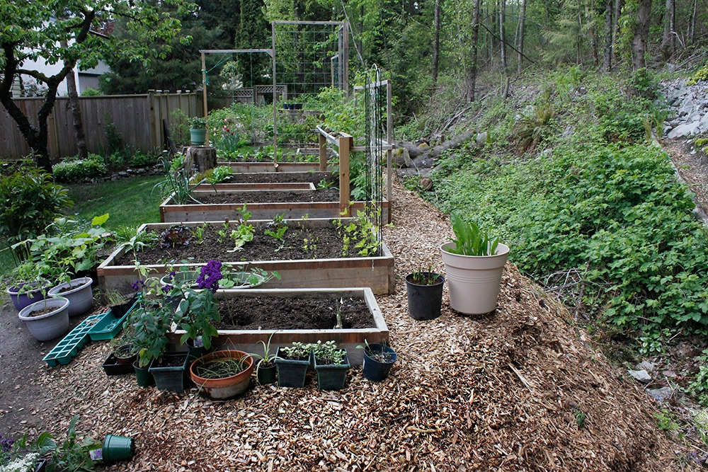 담이 있던 자리는 상당히 지저분했기 때문에 그곳을 여러 차례 정리하고, 평평하게 만들어서 텃밭을 만들었다. 그러다 보니 지반이 약해서 자꾸만 땅이 주저앉는 것이 문제였다. 작년에도 여러 차례 흙과 우드칩(wood chips)을 깔아줬으나, 올해에도 그 작업이 필요했다.