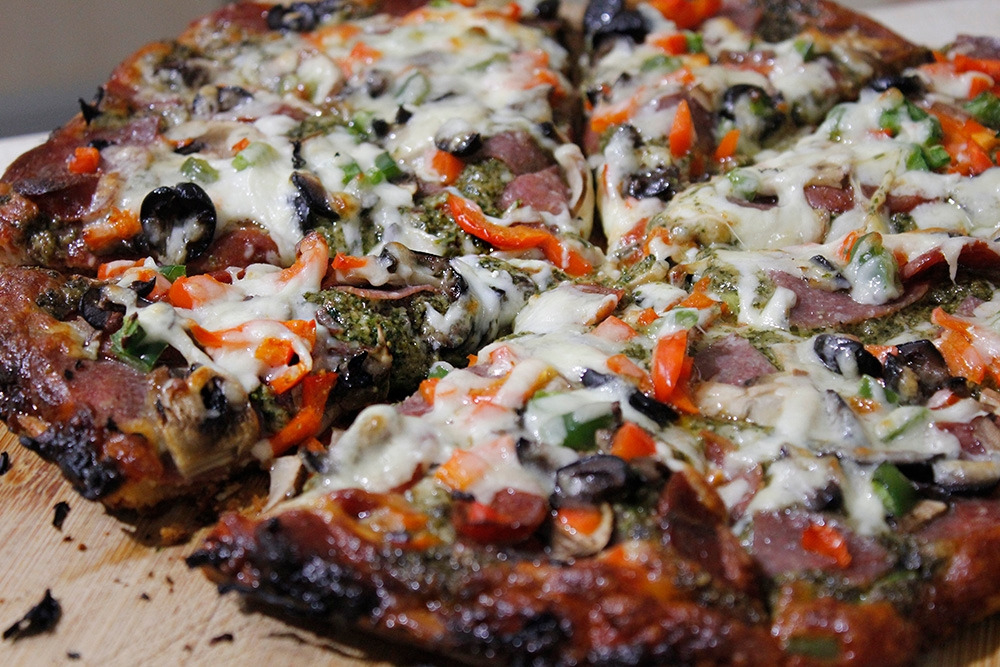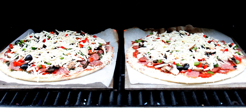그래서 하나는 페스토 소스, 나머지 하나는 우리 집에서 만든 피자 소스를 얹어서 바비큐 그릴에서 구워냈다. 이렇게 돌판 얹어서 바비큐에서 구우면 화덕 피자 맛이 나서 좋다. 일반 오븐에서도 피자 스톤을 이용하면 비슷하게 즐길 수 있다.
