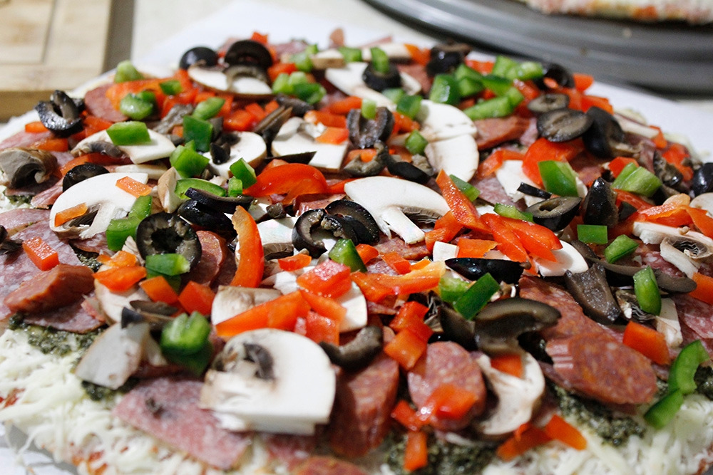 그리고는 집에 있는 토핑을 적당히 얹어줬다. 양송이, 할라피뇨, 빨간 피망, 페페로니, 햄을 얹고 치즈로 마무리! 평소에는 종류를 훨씬 다양하게 하지만, 이번엔 좀 절제하였다.