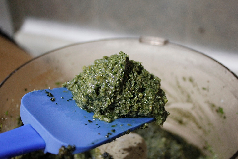 갈아주는 도구는, 믹서기나 푸드 프로세서 등을 이용한다. 처음에는 잎과 견과류 정도만 넣어서 좀 섞어준 후, 파르메지아노 치즈 간 것과 마늘, 소금, 후추 다 넣고 다시 갈아주었다. 그리고 마지막으로 올리브 오일을 넣으면서 농도를 맞췄다.