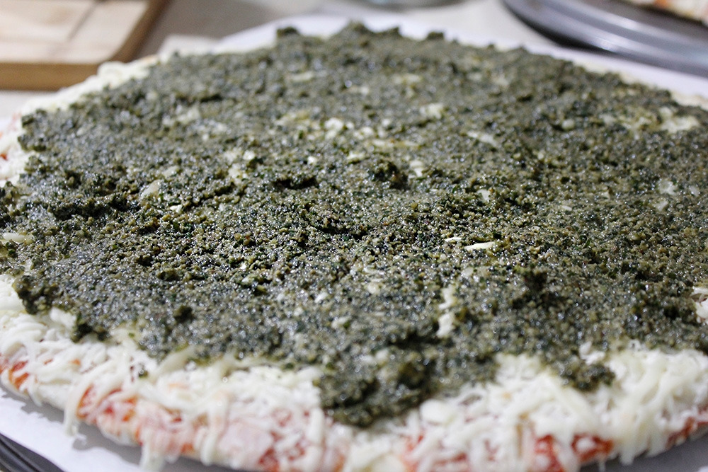 저녁 먹을 시간이 되었길래, 냉동피자를 꺼내서 위에다가 얼른 페스토를 발라줬다. 일반 피자 도우를 사용한다면 반죽 위에 바로 올리겠지만, 우리는 오늘 간단히 해결하기로 한 것이었으니, 이 위에 그냥 얹었다.