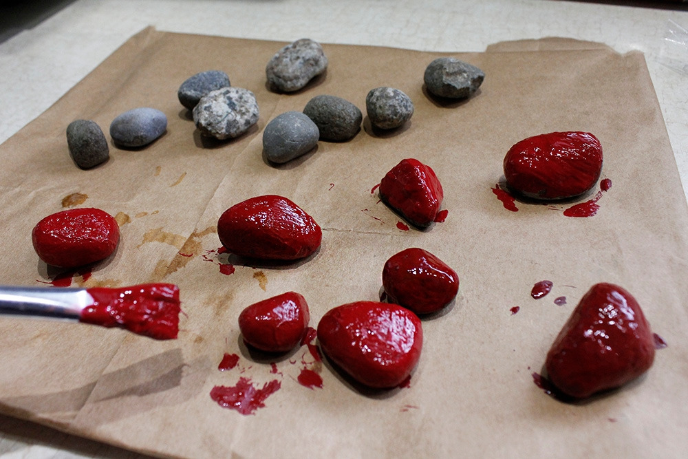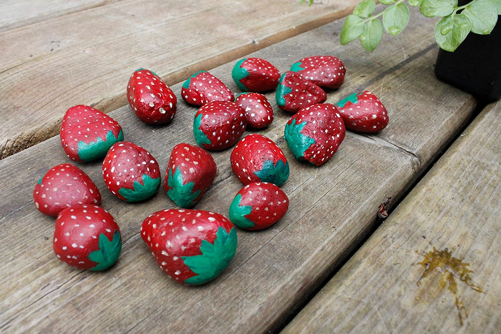일단 작은 돌멩이를 줍는다. 딸기 모양이 될만한 것들로 골랐다. 우리 집 딸기는 그리 크지 않으므로 되도록 자그마한 것들을 고르려고 애를 썼다. 그렇게 한 움큼 모아서는 일단 깨끗하게 씻었다.