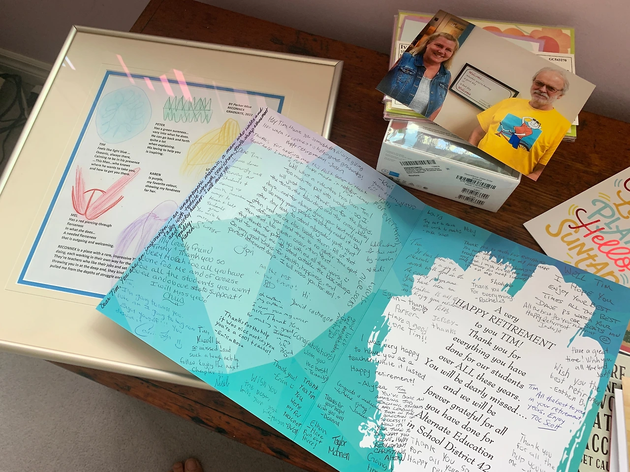 그리고 지난주 목요일, 드디어 마지막 날이 되었다. 평소 3시쯤 일정이 끝나지만, 그냥 일찍 12시쯤 퇴근하며 마무리를 하겠다던 남편의 의도를 눈치챈 동료 로리가, 다른 사람들에게 그전에 와서 작별인사를 하라고 했던 것이다. 그래서 사람들이 속속 교실로 찾아와서 작별 인사를 나누고, 눈물을 쏟았다. 인사말이 가득 담긴 카드와 여러 가지 선물을 받고 집으로 돌아왔다. 그의 가슴속이 복잡하게 가득했을 것이다.