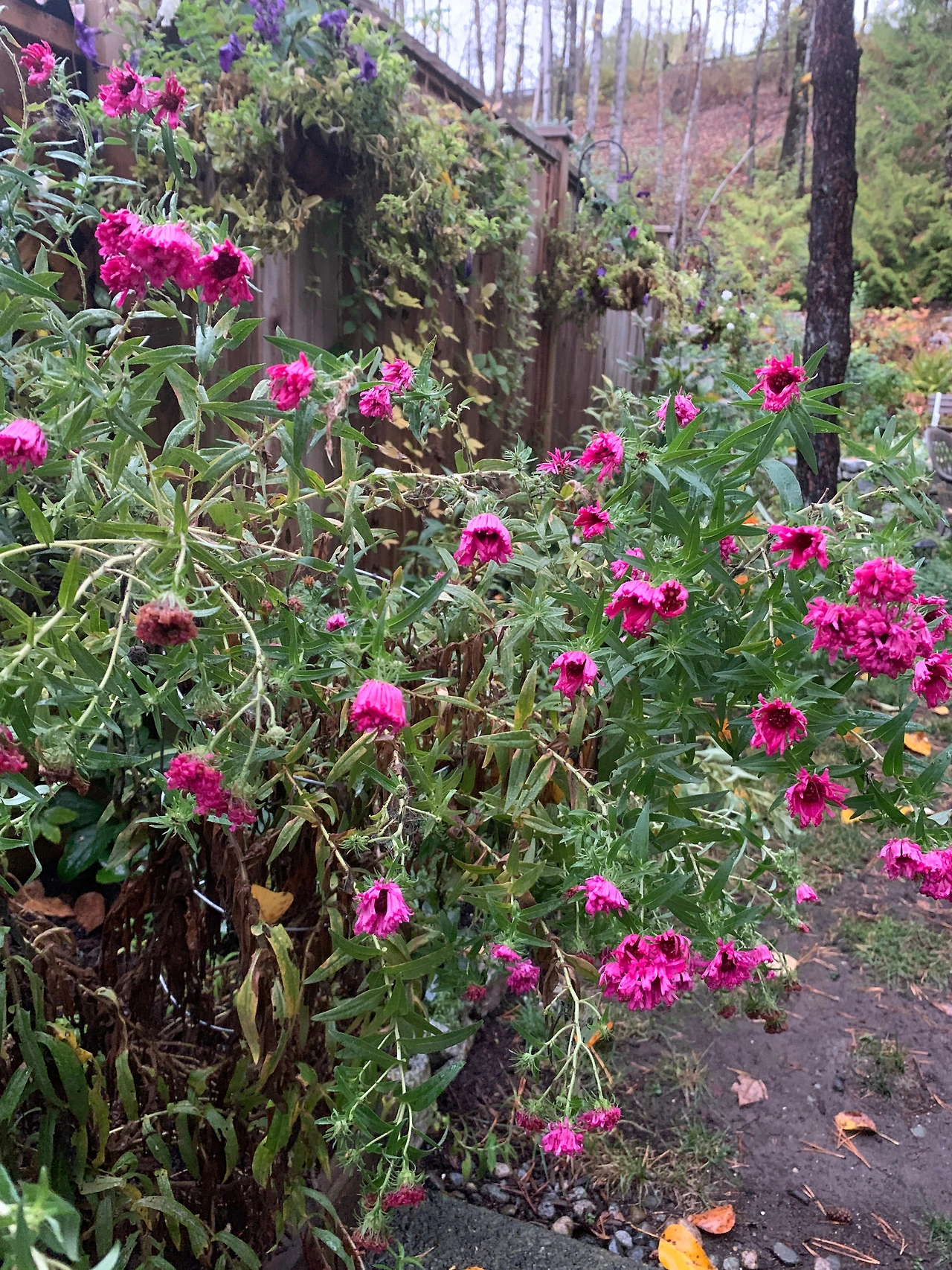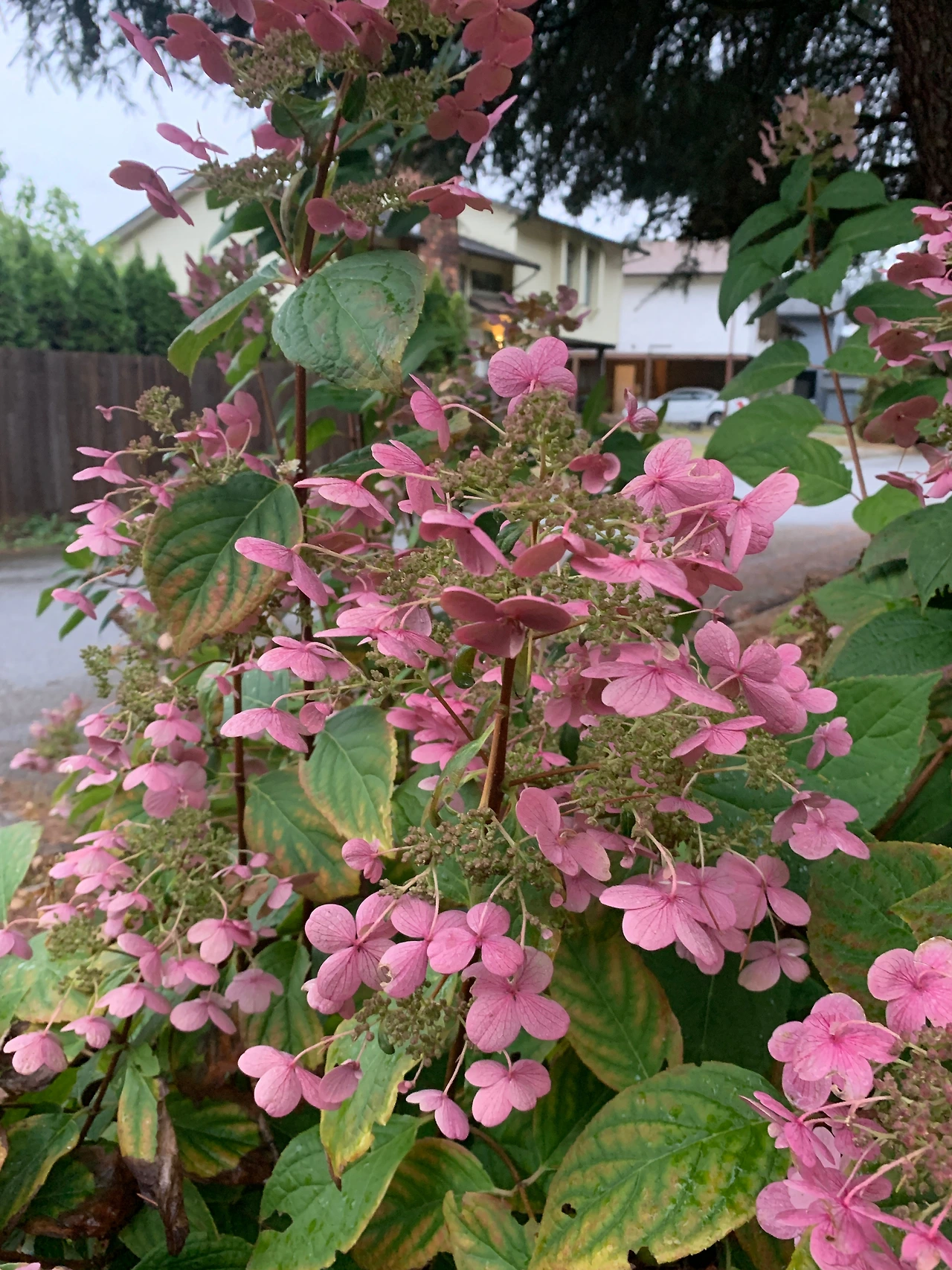 그리고 우리가 집에 돌아오기 사흘 전부터 밴쿠버에 비가 내리기 시작했다. 그래서 빛나게 유지된 정원을 만나지는 못했다. 대신 비에 흠뻑 젖은 정원을 만났다. 투구꽃과 애스터의 전성기를 놓친 것이 안타깝지만, 빗속에서도 아름다운 빛깔을 보여주었다. 여름내 하얗게 빛났던 퀵파이어 목수국은 완전히 분홍으로 바뀌어있었다.